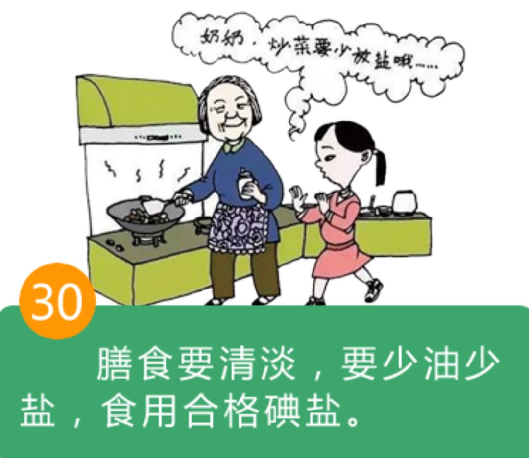 30.膳食要清淡,要少油、少盐、少糖,食用合格碘盐。