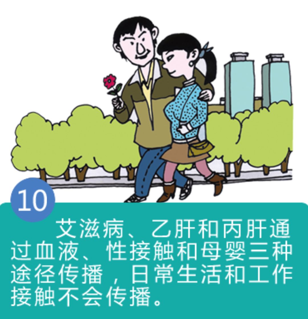 10.艾滋病、乙肝和丙肝通过血液、性接触和母婴三种途径传播,日常生活和工作接触不会传播。