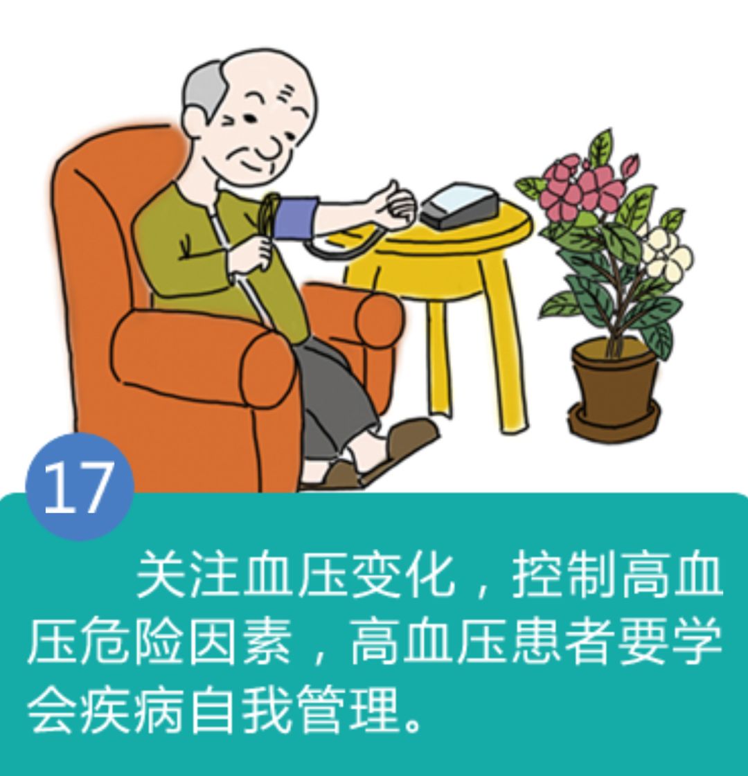 17.关注血压变化,控制高血压危险因素,高血压患者要学会自我健康管理。