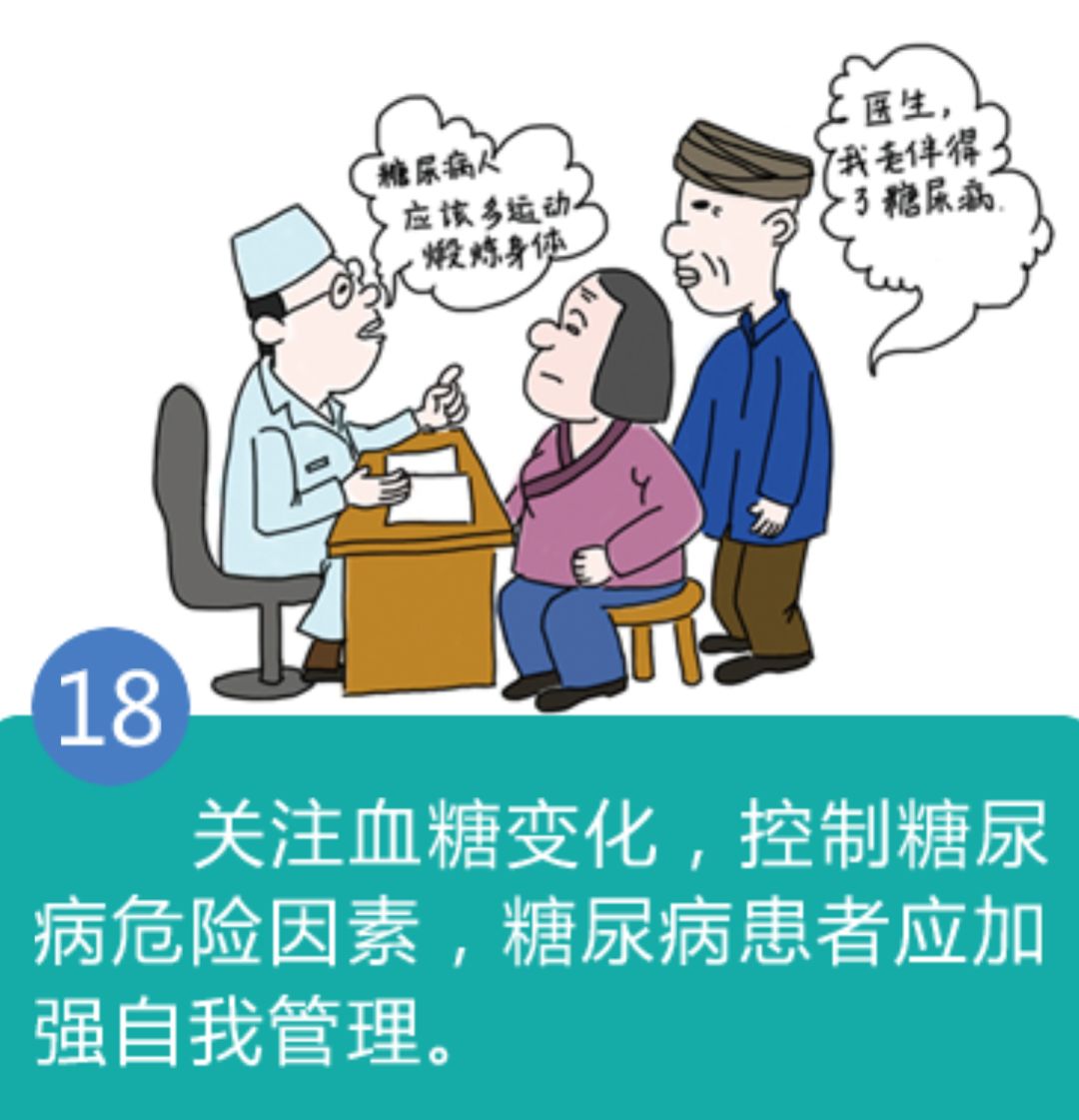 18.关注血糖变化,控制糖尿病危险因素,糖尿病患者应当加强自我健康管理。