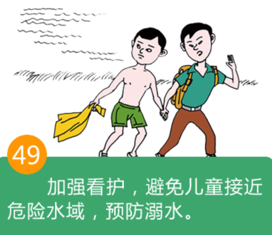 49.加强看护和教育,避免儿童接近危险水域,预防溺水。