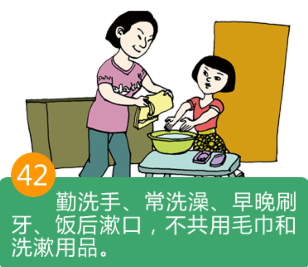 42.勤洗手、常洗澡、早晚刷牙、饭后漱口,不共用毛巾和洗漱用品。