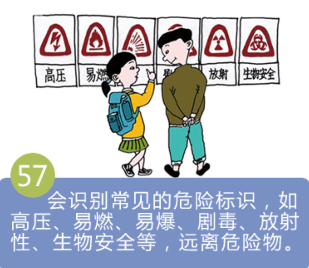 57.会识别常见的危险标识,如高压、易燃、易爆、剧毒、放射性、生物安全等,远离危险物。