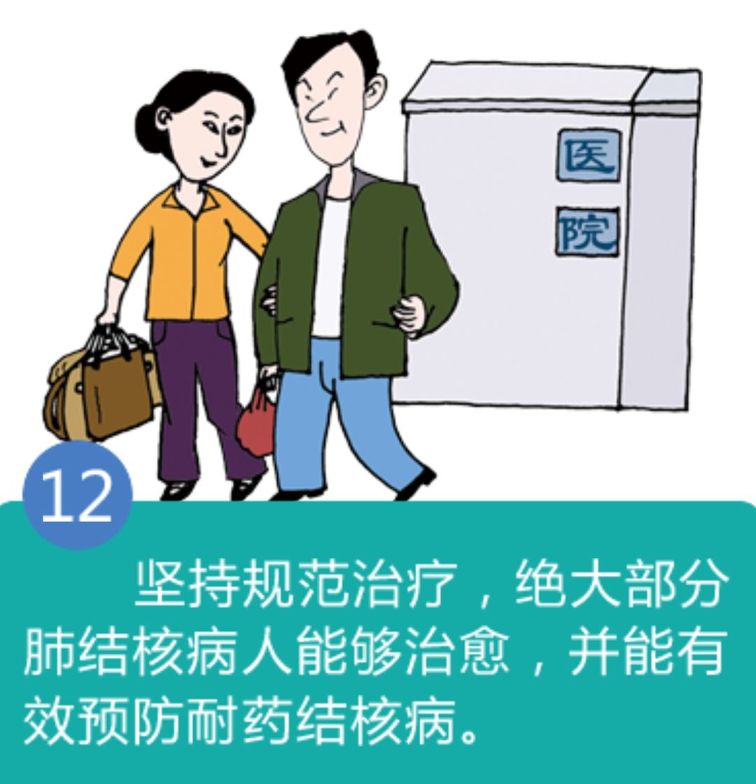 12.坚持规范治疗,大部分肺结核病人能够治愈,并能有效预防耐药结核的产生。