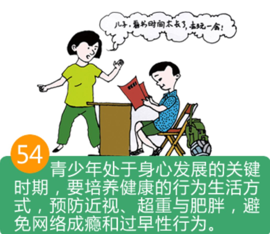 54.青少年处于身心发展的关键时期,要培养健康的行为生活方式,预防近视、超重与肥胖,避免网络成瘾和过早性行为。