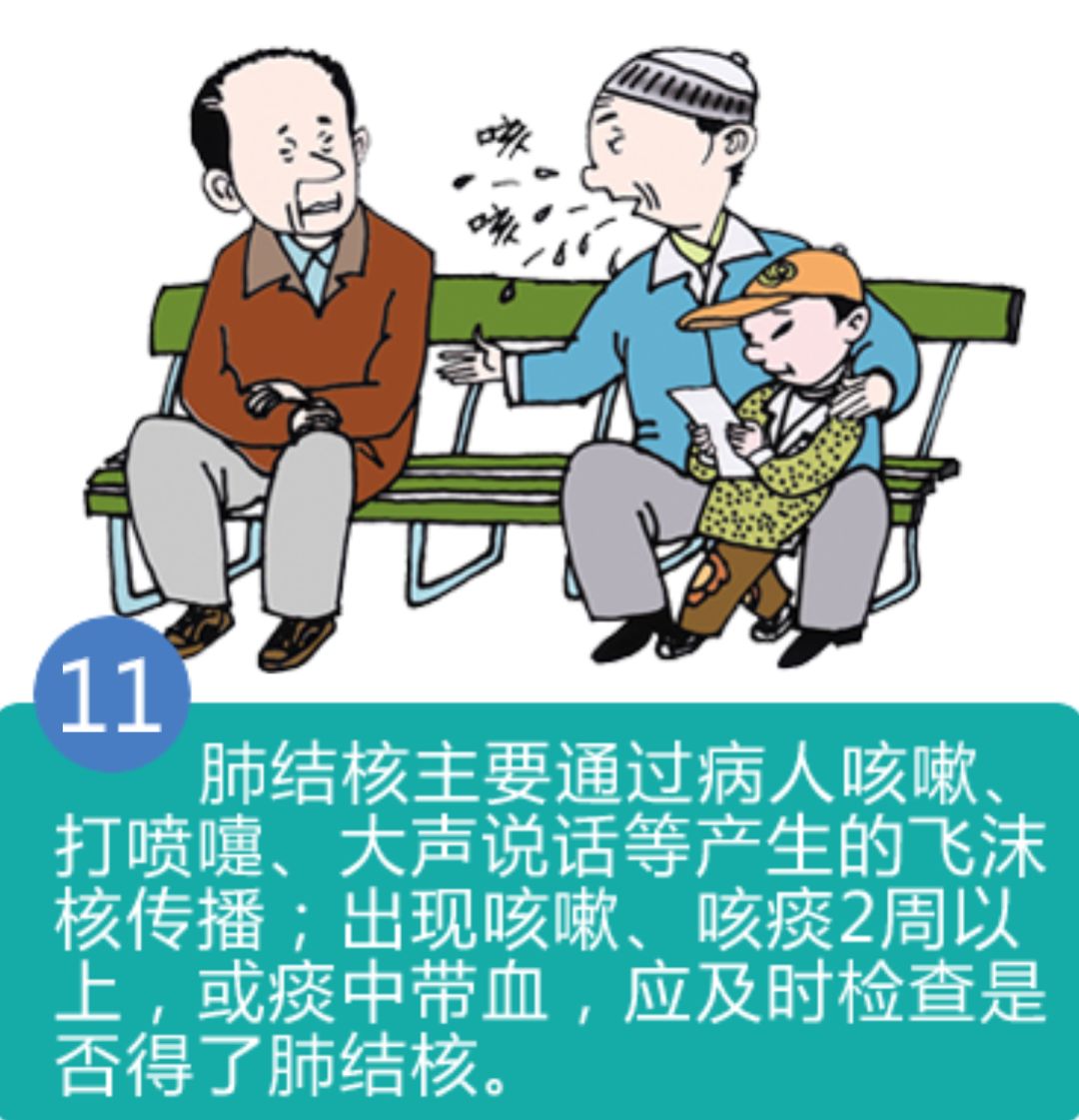11.肺结核主要通过病人咳嗽、打喷嚏、大声说话等产生的飞沫传播;出现咳嗽、咳痰2周以上,或痰中带血,应当及时检查是否得了肺结核。