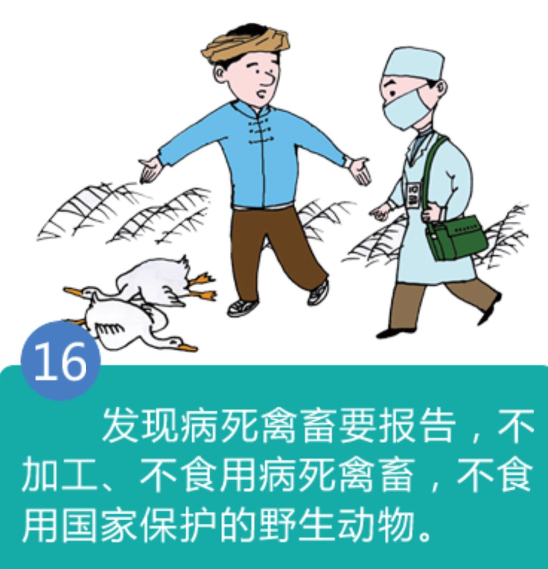 16.发现病死禽畜要报告,不加工、不食用病死禽畜,不食用野生动物。