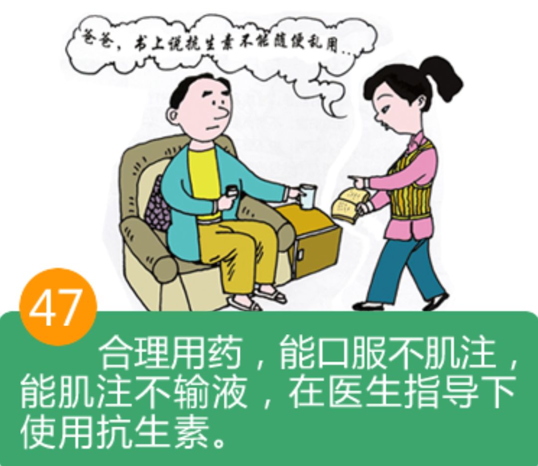 47.合理用药,能口服不肌注,能肌注不输液,在医生指导下使用抗生素。