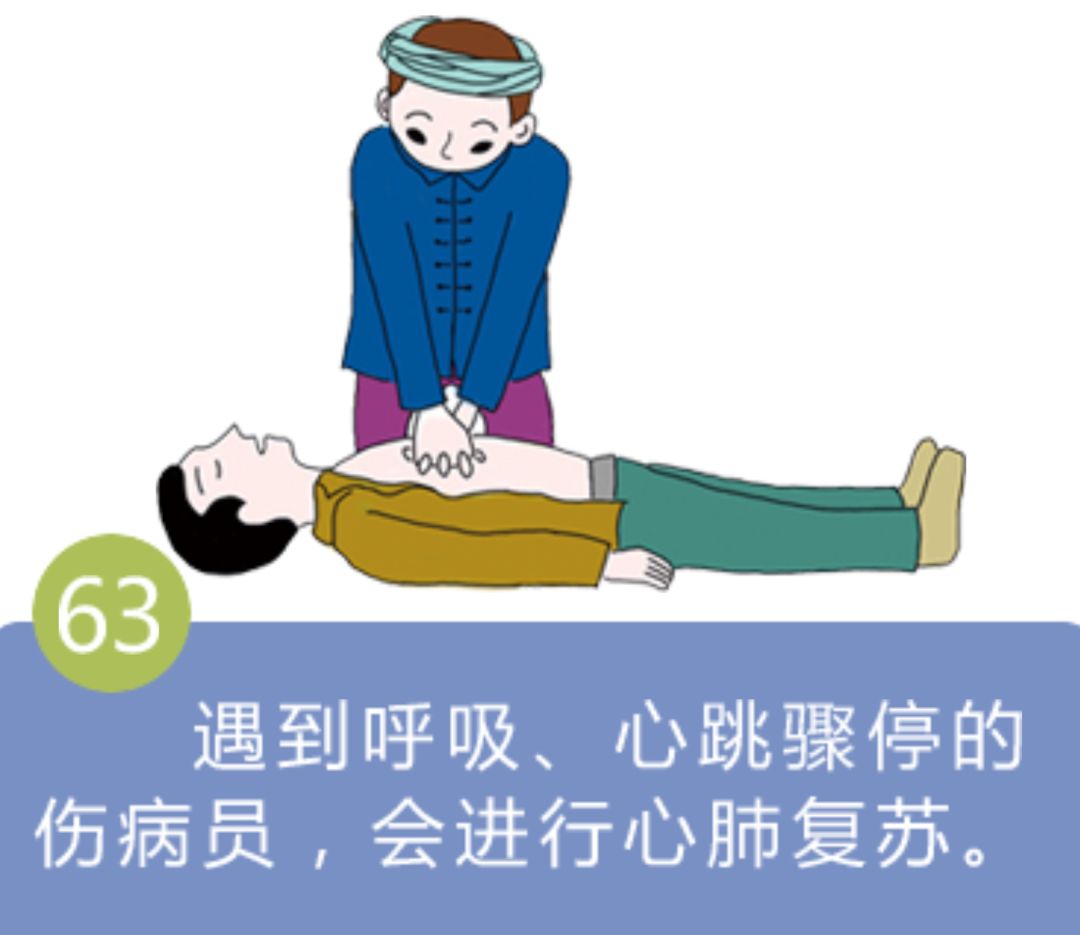 63.遇到呼吸、心跳骤停的伤病员,会进行心肺复苏。