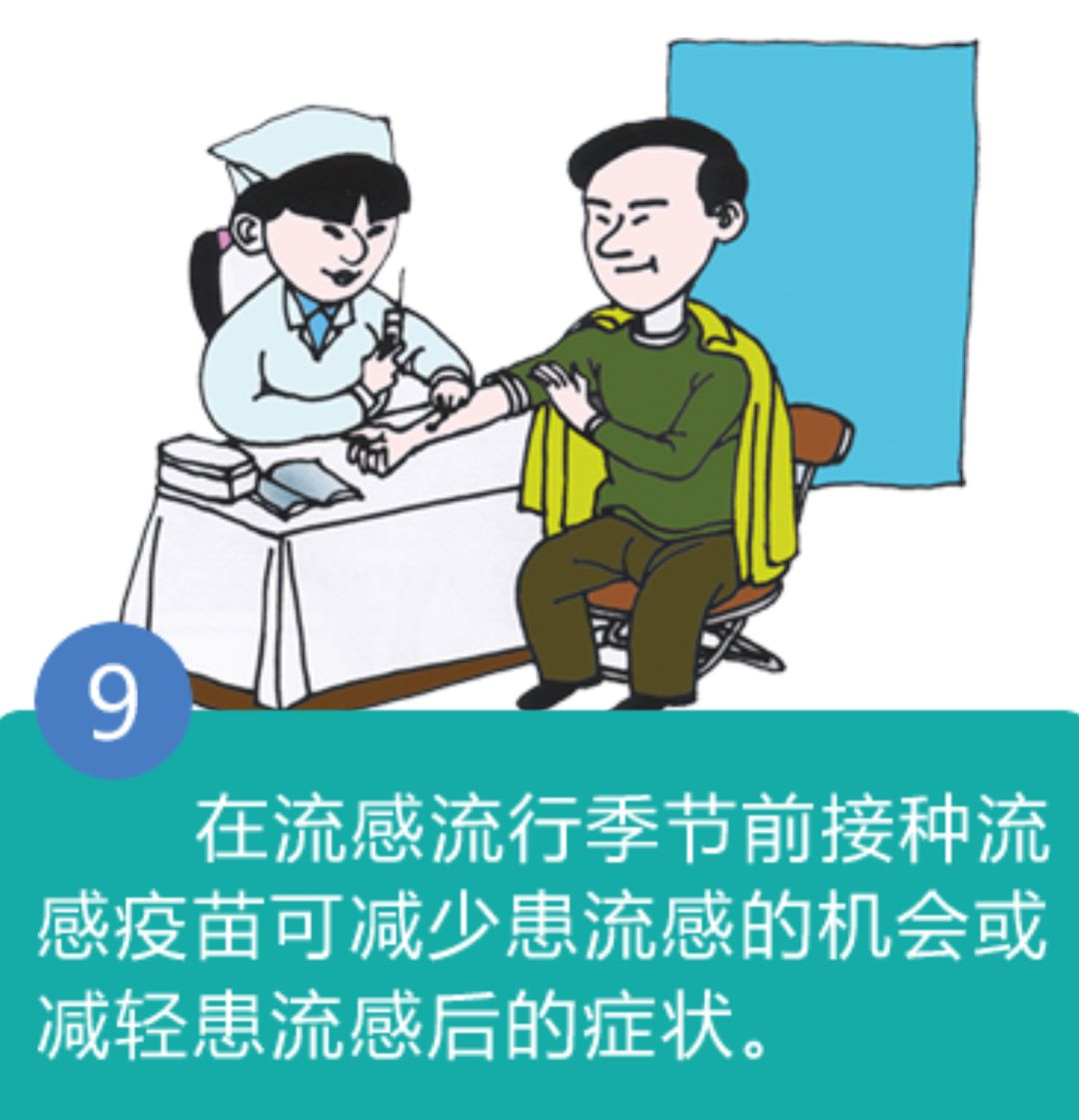 9.在流感流行季节前接种流感疫苗可减少患流感的机会或减轻患流感后的症状。