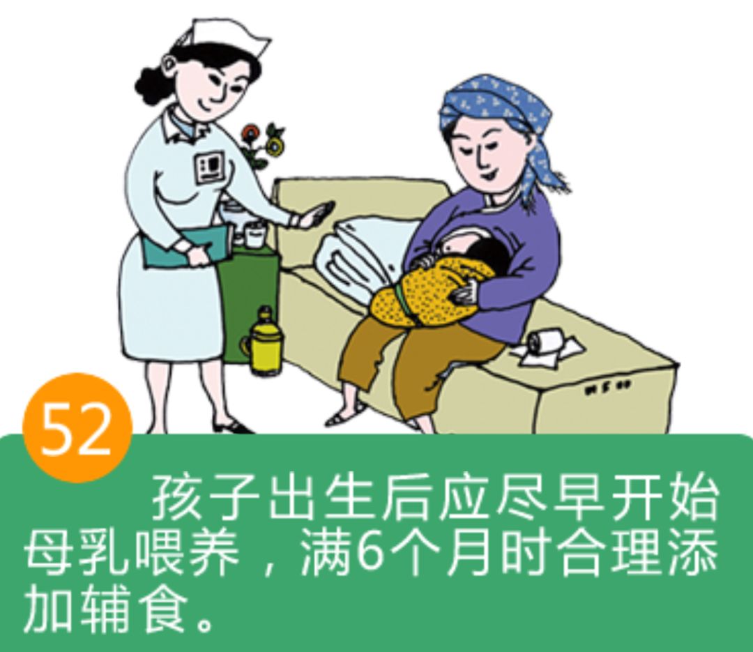 52.孩子出生后应当尽早开始母乳喂养,满6个月时合理添加辅食。