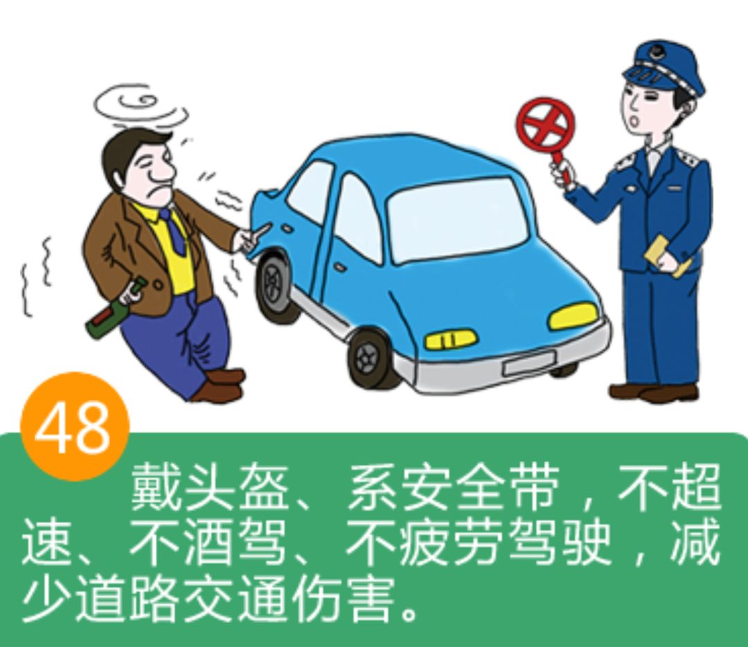 48.戴头盔、系安全带,不超速、不酒驾、不疲劳驾驶,减少道路交通伤害。