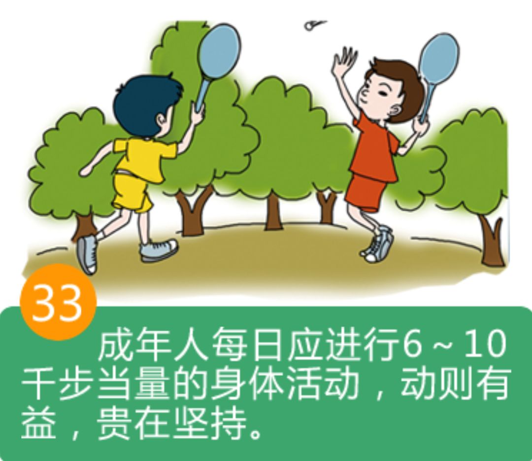 33.成年人每日应当进行6~10千步当量的身体活动,动则有益,贵在坚持。