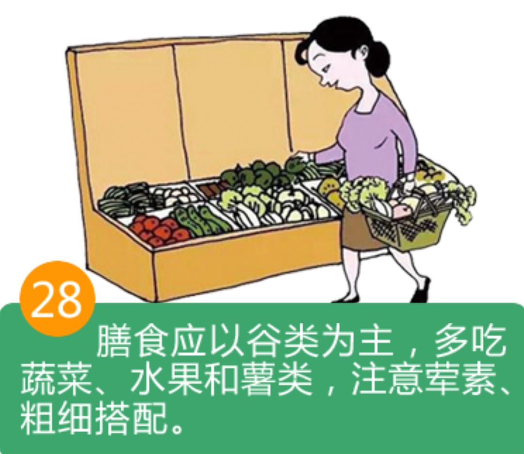 28.膳食应当以谷类为主,多吃蔬菜、水果和薯类,注意荤素、粗细搭配。
