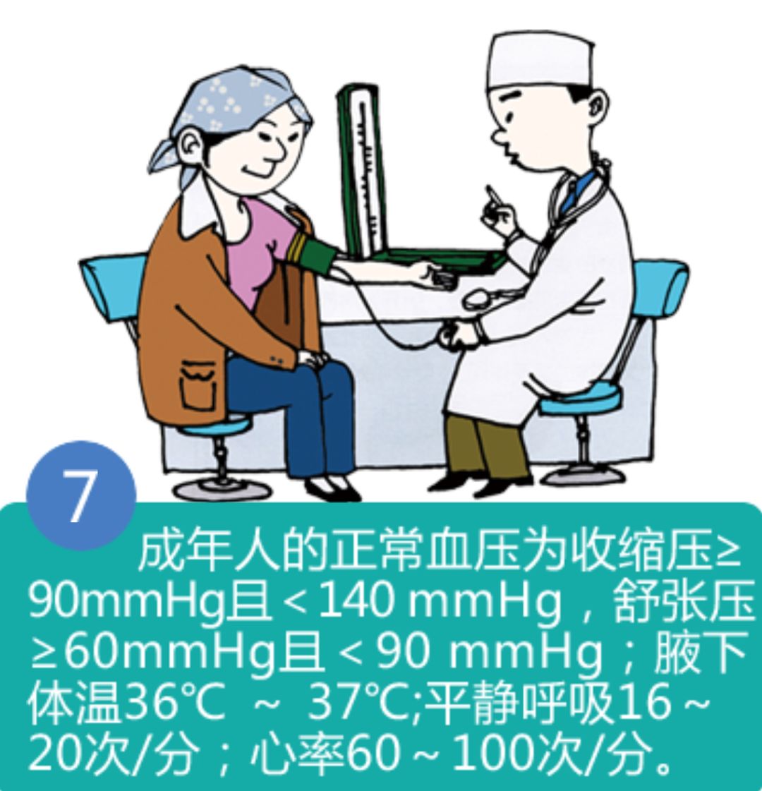 7.成年人的正常血压为收缩压≥90mmHg且<140 mmHg,舒张压≥60mmHg且<90 mmHg;腋下体温36℃~37℃;平静呼吸16~20次/分;心率60~100次/分。