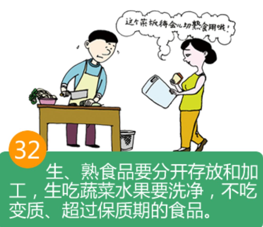 32.生、熟食品要分开存放和加工,生吃蔬菜水果要洗净,不吃变质、超过保质期的食品。