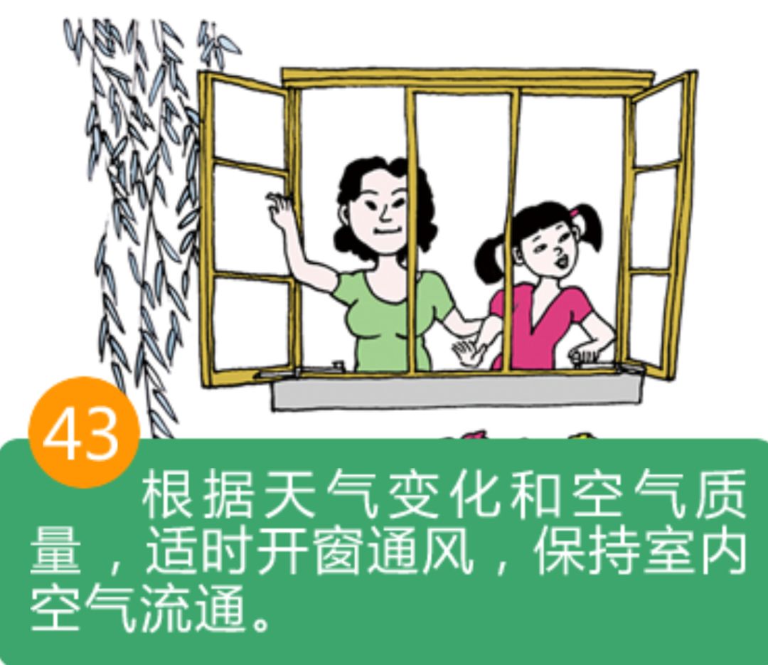 43.根据天气变化和空气质量,适时开窗通风,保持室内空气流通。