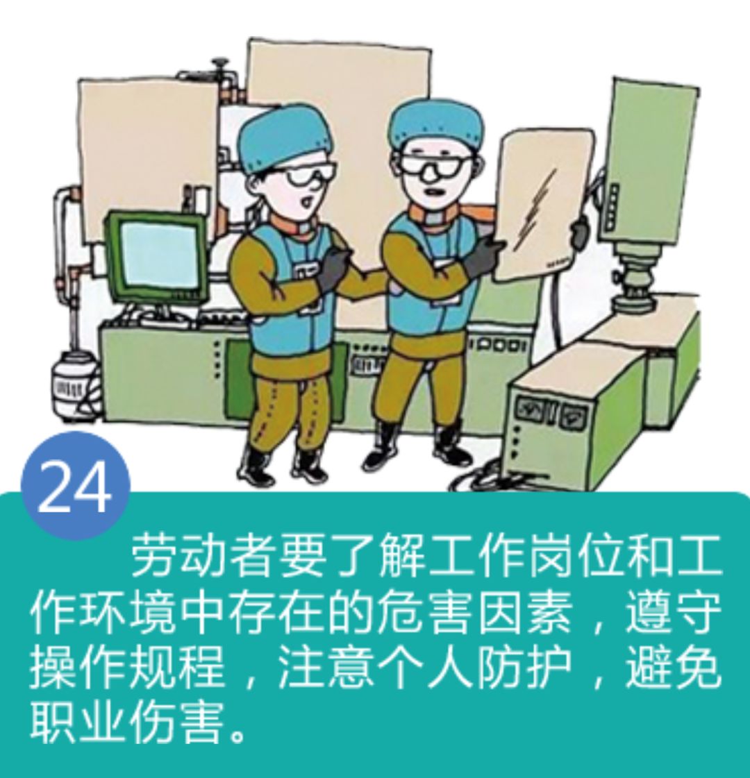 24.劳动者要了解工作岗位和工作环境中存在的危害因素,遵守操作规程,注意个人防护,避免职业伤害。