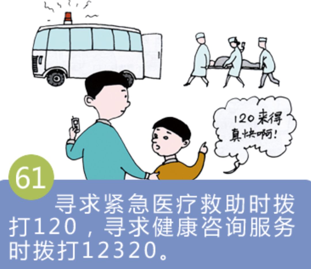 61.寻求紧急医疗救助时拨打120,寻求健康咨询服务时拨打12320。