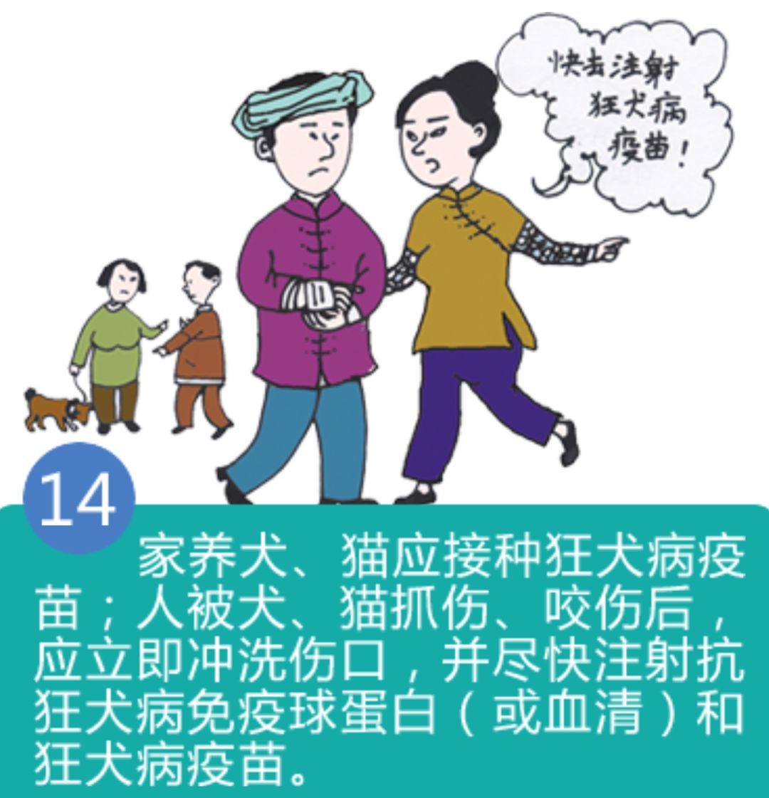 14.家养犬、猫应当接种兽用狂犬病疫苗;人被犬、猫抓伤、咬伤后,应当立即冲洗伤口,并尽快注射抗狂犬病免疫球蛋白(或血清)和人用狂犬病疫苗。