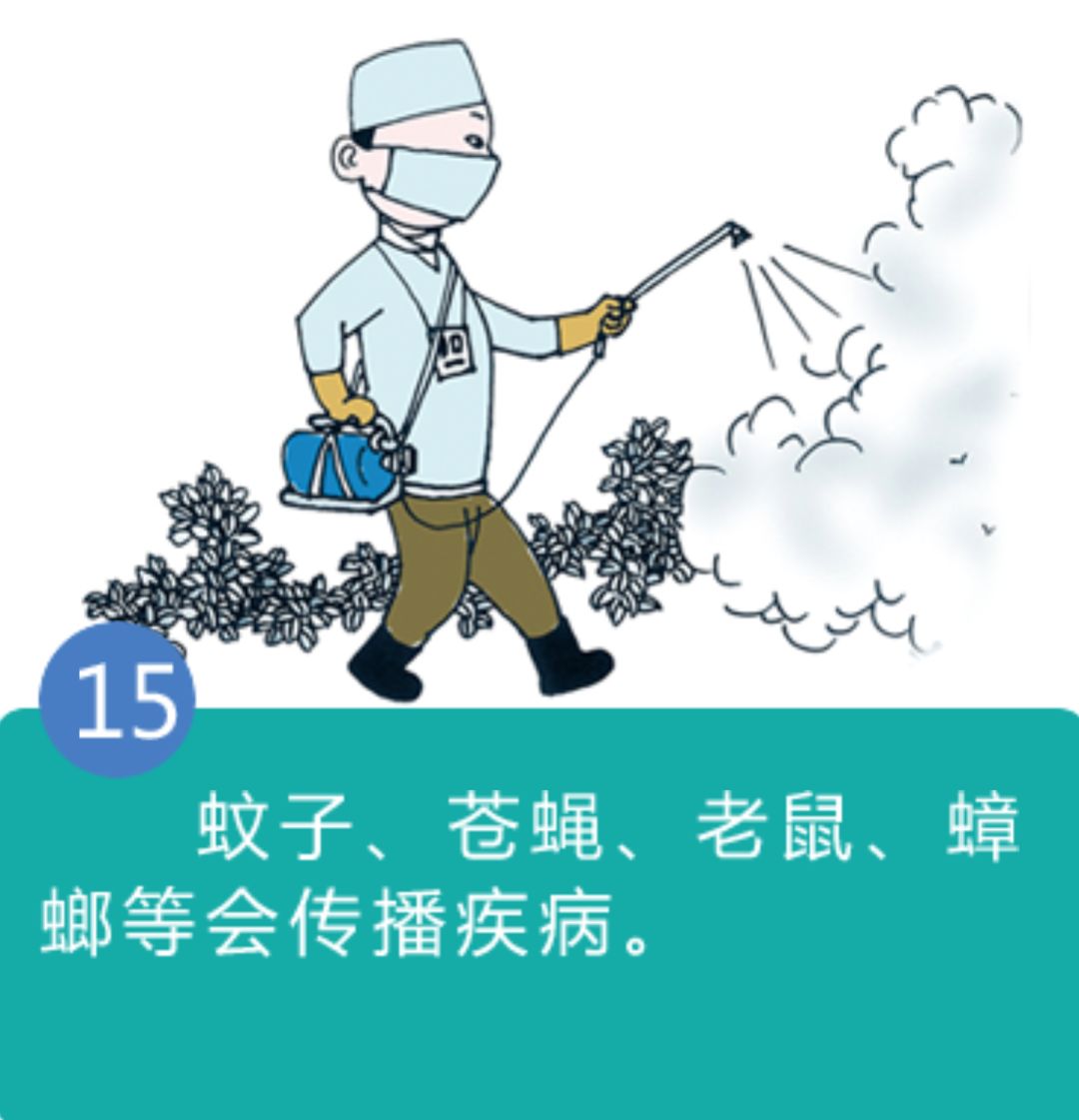 15.蚊子、苍蝇、老鼠、蟑螂等会传播疾病。