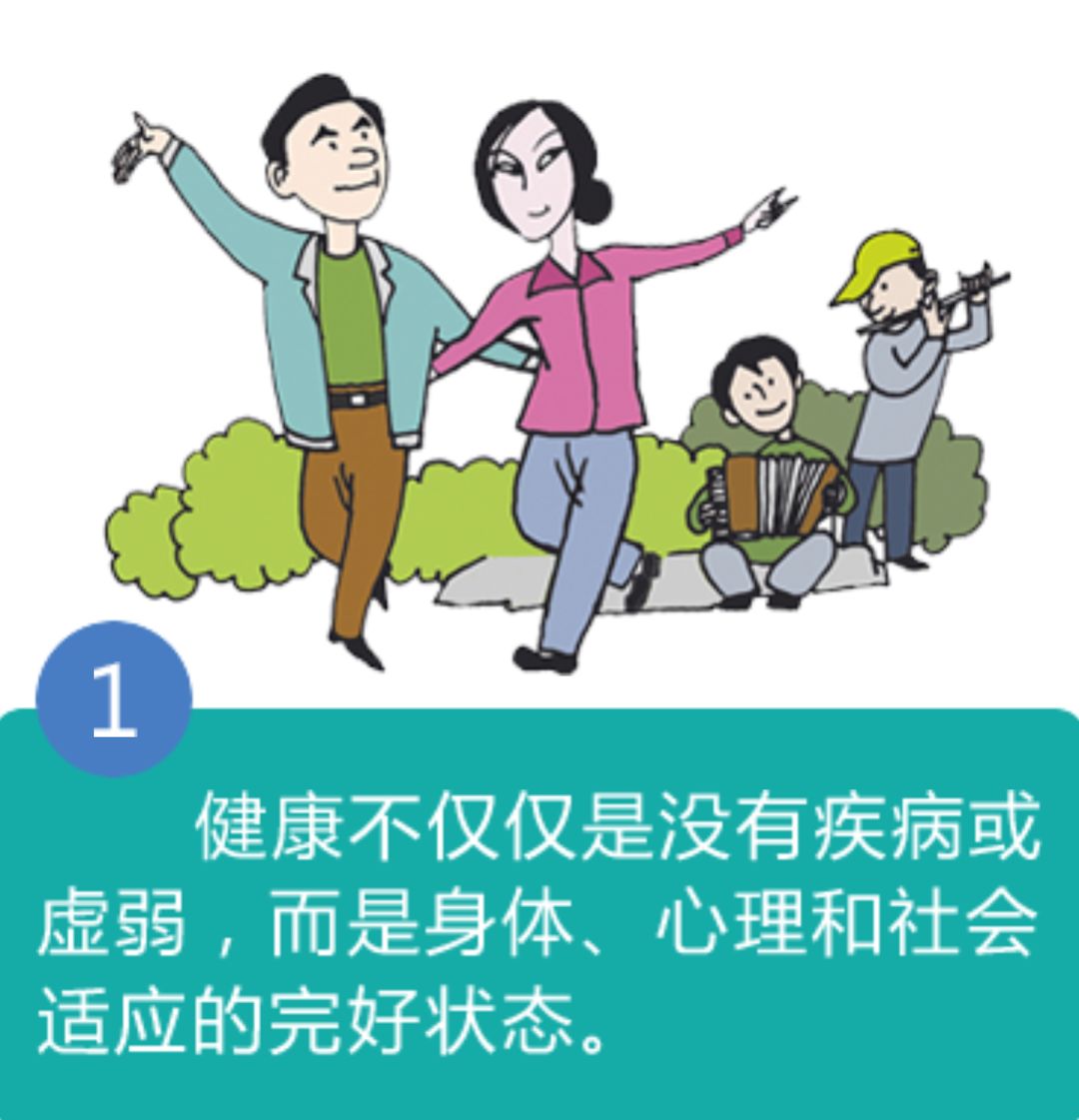 1.健康不仅仅是没有疾病或虚弱,而是身体、心理和社会适应的完好状态。