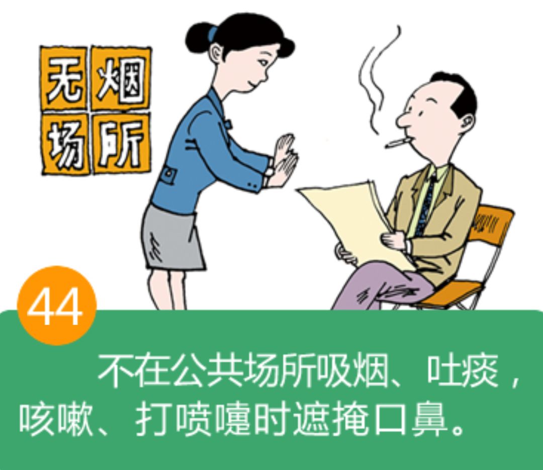 44.不在公共场所吸烟、吐痰,咳嗽、打喷嚏时遮掩口鼻。
