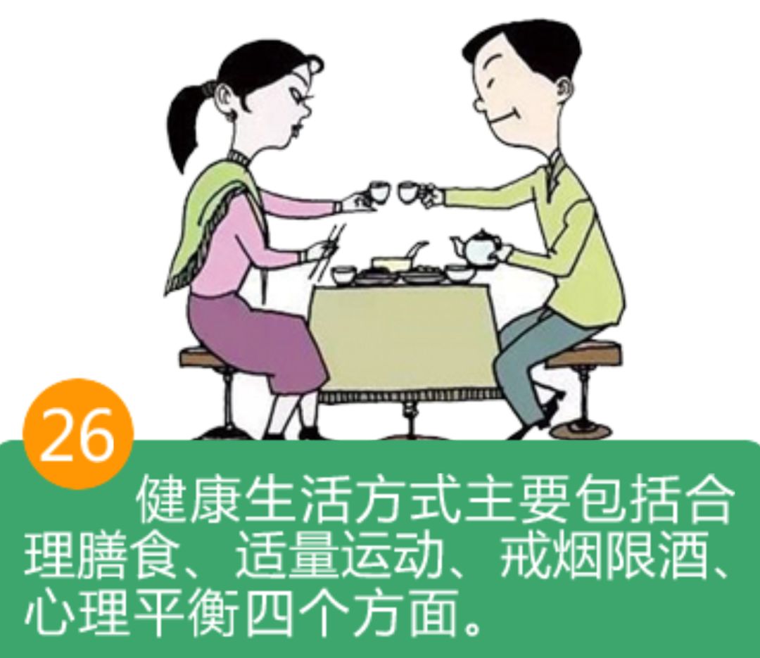 26.健康生活方式主要包括合理膳食、适量运动、戒烟限酒、心理平衡四个方面。