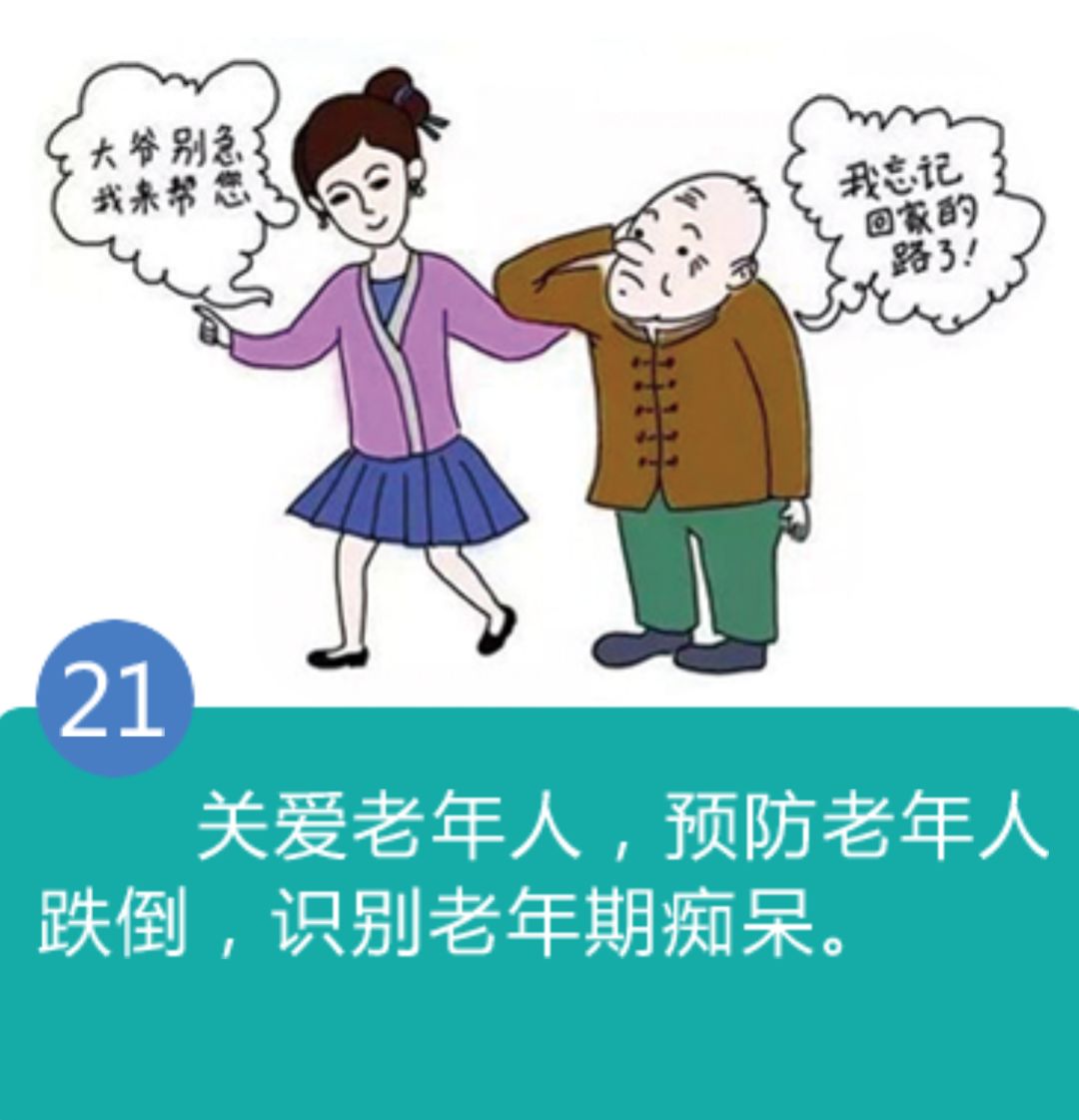 21.关爱老年人,预防老年人跌倒,识别老年期痴呆。