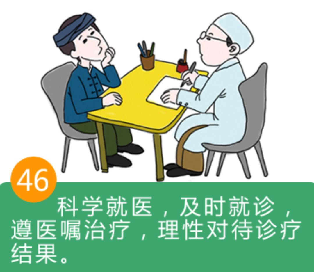46.科学就医,及时就诊,遵医嘱治疗,理性对待诊疗结果。