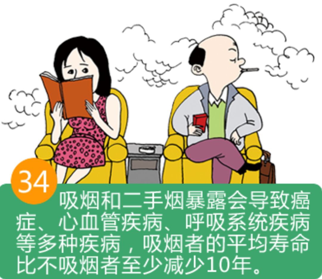 34.吸烟和二手烟暴露会导致癌症、心血管疾病、呼吸系统疾病等多种疾病。