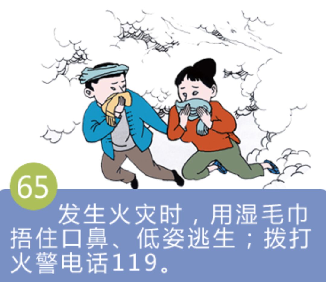 65.发生火灾时,用湿毛巾捂住口鼻、低姿逃生;拨打火警电话119。