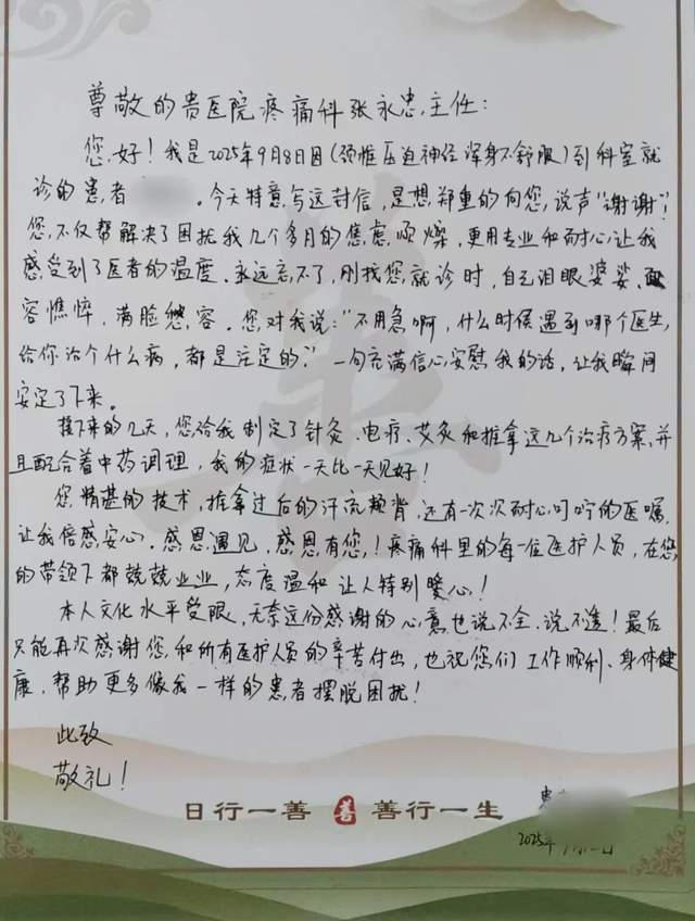 “疼痛康复科里的每一位医护人员都兢兢业业,态度温和,让人感到特别暖心! ”宋女士在信中由衷地写道。这封感谢信,不仅是对张永忠主任精湛医术与仁爱之心的肯定,更是对疼痛康复科全体工作人员将治疗与人文关怀相结合,最终赢得患者高度认可的卓越价值体现。