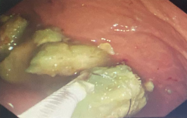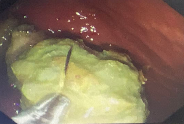 随后的胃镜检查结果让人吃惊:刘大哥的胃里形成了一个约5×6厘米大小的胃石,表面坚硬,正在摩擦和刺激胃黏膜,导致局部炎症和糜烂,如得不到及时处理,会有引发穿孔的风险!