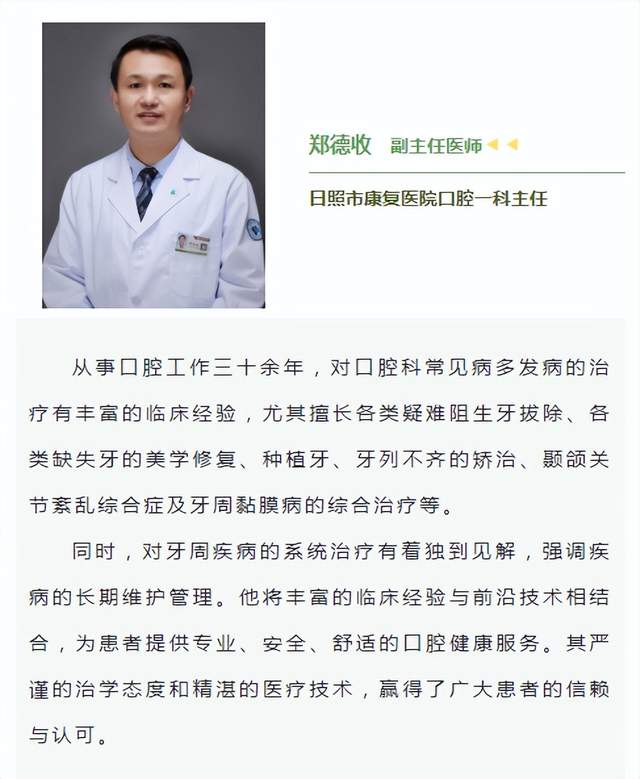 口腔科对医生队伍有着严格的要求,每一位医生均经过层层考核。科主任郑德收有着多年临床经验且多次外出进修深造,学识深远、技术精湛。从种植体、牙冠、术后养护、服务保障,全面护航!