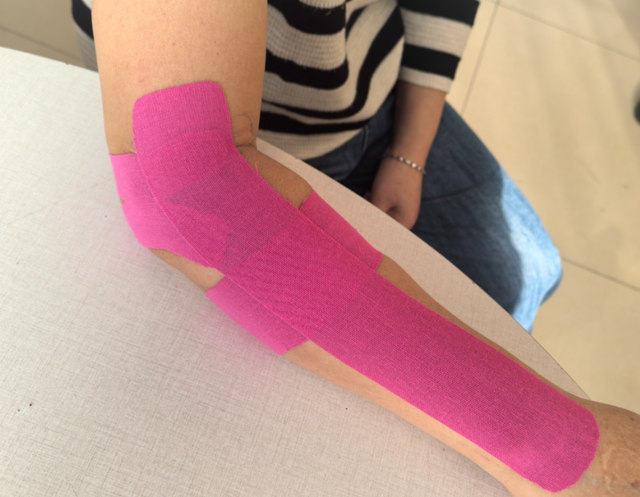 治疗结束后,使用肌内效贴布进行贴扎治疗,为疲惫的肩关节提供支撑,促进淋巴回流和血液循环,让治疗效果持续更久。