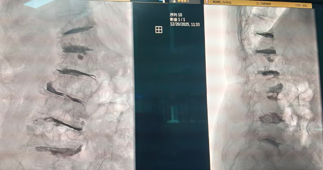 “就好比给两节脊椎骨之间塌陷的“软垫”(椎间盘),打进去一种特殊的 “水泥”。” 尹绍猛主任解释道。