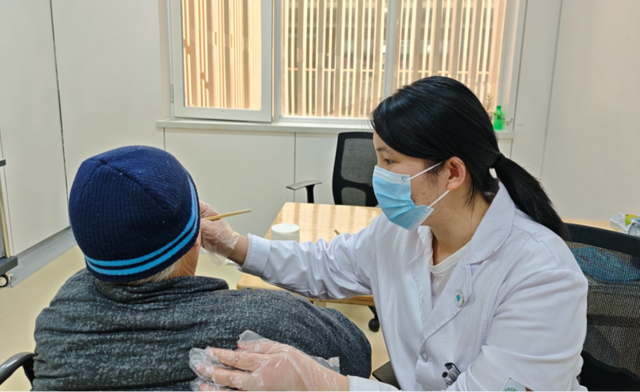 孙蕾正在帮助患者做吞咽障碍康复训练