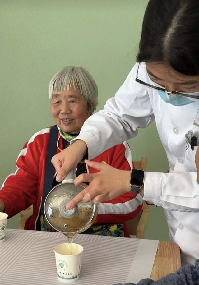 这里没有程式化的照料,只有家人般的贴心。医护人员亲手制作的茯苓山药红豆桂花糕,软糯清甜,不仅满足了味蕾,更融入了健脾安神的养生智慧;一杯温润的菊花枸杞茶,氤氲着清香,滋养着长者的身心,完美诠释了“药食同源”的东方养生哲学。礼轻情意重,当这份饱含心意的糕点与茶饮,连同驱邪祈福的中药香囊一同送到每一位老人手中时,传递的已不仅是健康,更是被珍视的温暖。