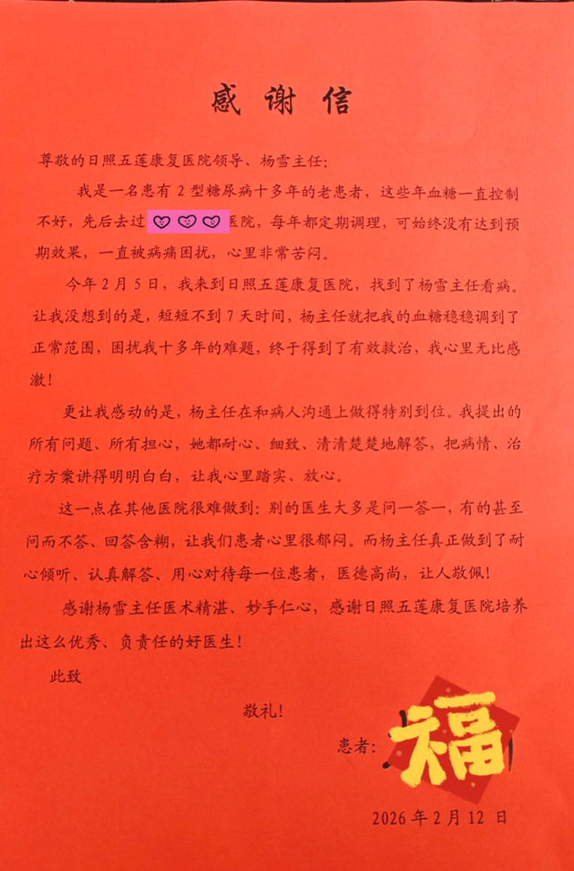 一封感谢信,是认可,是激励,更是医患情深的温暖注脚。在日照市康复医院,还有许多像杨雪一样的医生,他们用专业驱逐病痛,用耐心抚慰焦虑。