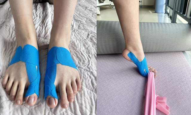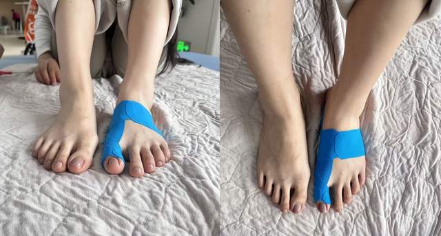 贴扎“扶正”,即刻减压:运用专业拇外翻矫正贴扎技术,以低弹性贴布轻柔引导拇趾回归中立位。目的在于放松紧张肌肉,减轻关节内挤压与疼痛,同时优化足底受力分布,为后续训练构建无痛稳定的力学环境。