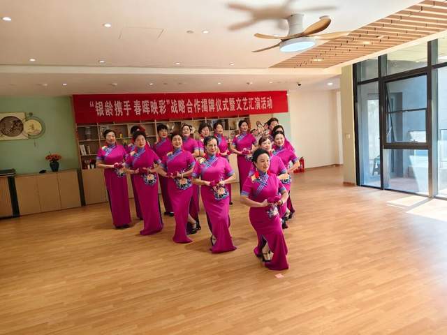 揭牌仪式后,活动进入欢乐的文艺汇演环节。县老年大学金晖艺术团带来了一系列精彩节目:唢呐独奏《欢天喜地开门红》以激昂旋律点燃全场;舞蹈《老百姓的菜篮子》舞出生活的烟火气与幸福感;京剧、黄梅戏等经典选段韵味悠长;特别是走秀表演《搀扶》,用优雅而温情的肢体语言诠释了相伴到老的人间真情,赢得满堂喝彩。台上精彩纷呈,台下笑容洋溢,整个海棠厅沉浸在一片欢乐温暖的氛围中。